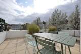 Entrée, séjour avec cuisine ouverte équipée sur grande terrasse sud-ouest, deux chambres (placards), salle de bains, wc.