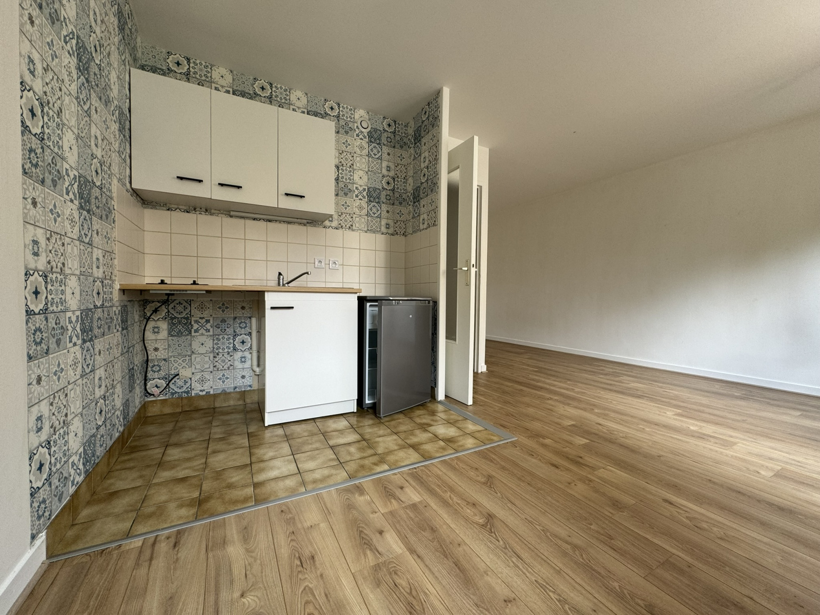 Entrée (placards), pièce principale avec kitchenette aménagée et équipée (plaques de cuisson, frigo), salle de bains avec wc.