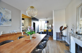 Entrée, réceptions (séjour, salon et salle à manger) 75 m² parquet cheminées, petite cuisine équipée attenante, wc lave-mains, placard.
