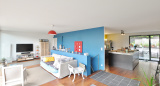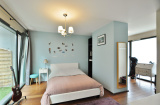 A l'étage, séjour et cuisine ouverte avec îlot central entièrement équipée (l'ensemble 54 m² sur parquet) sur petite terrasse, arrière-cuisine (machines), 3ème chambre (grand placard), salle d'eau avec wc.