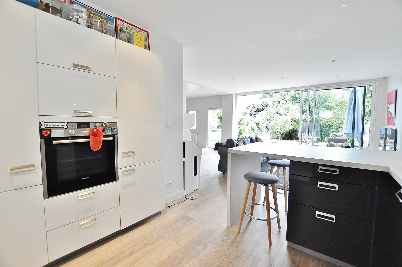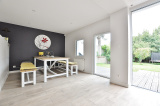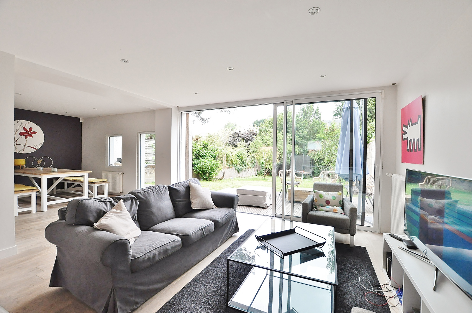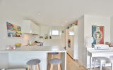 Entrée, séjour et salle à manger avec cuisine ouverte aménagée et équipée (40m²), l'ensemble sur terrasse et jardin sud-ouest.