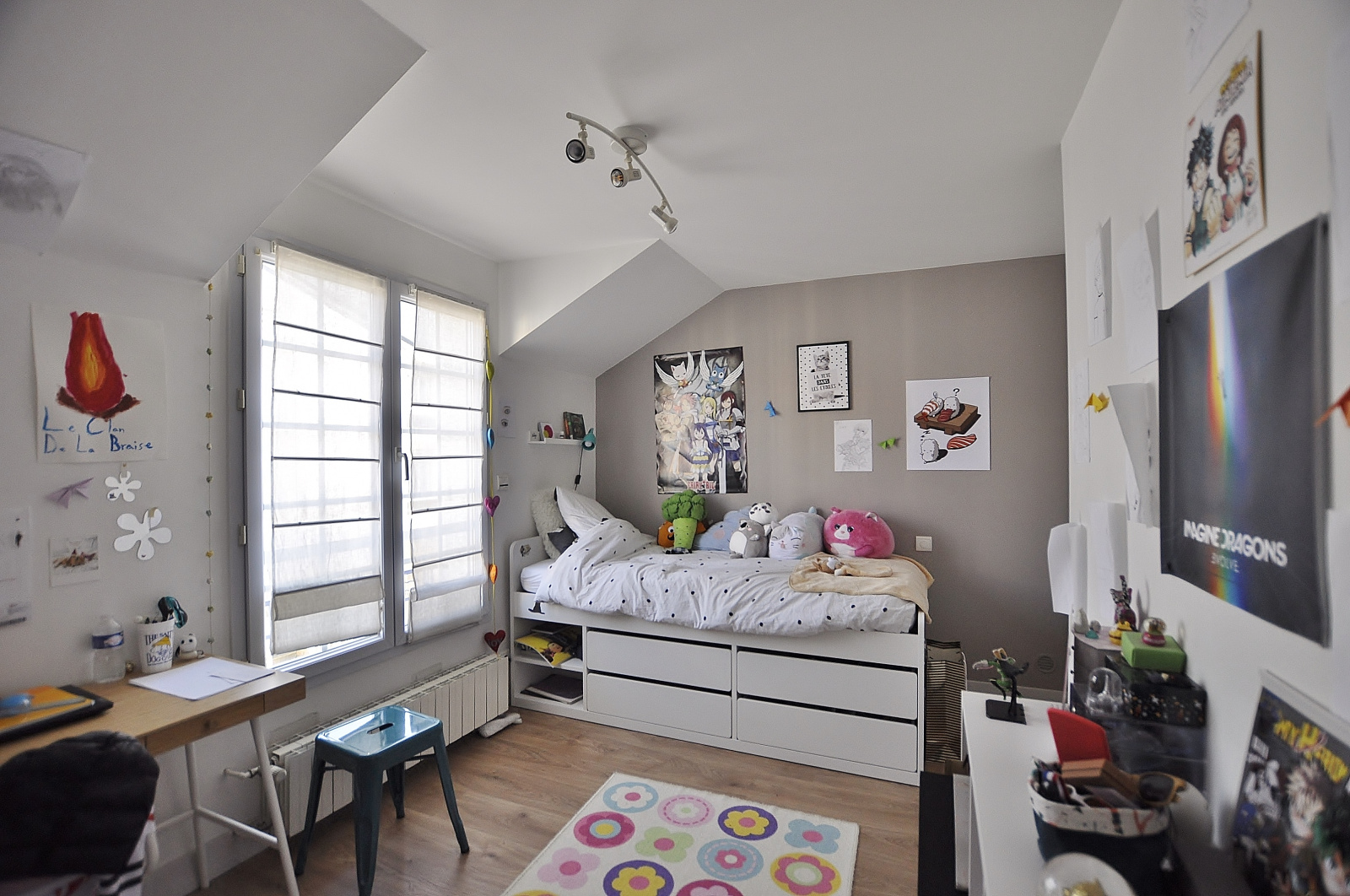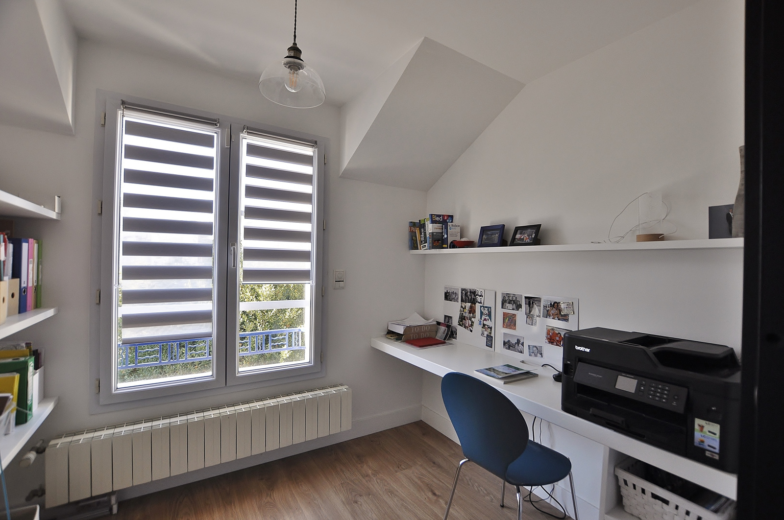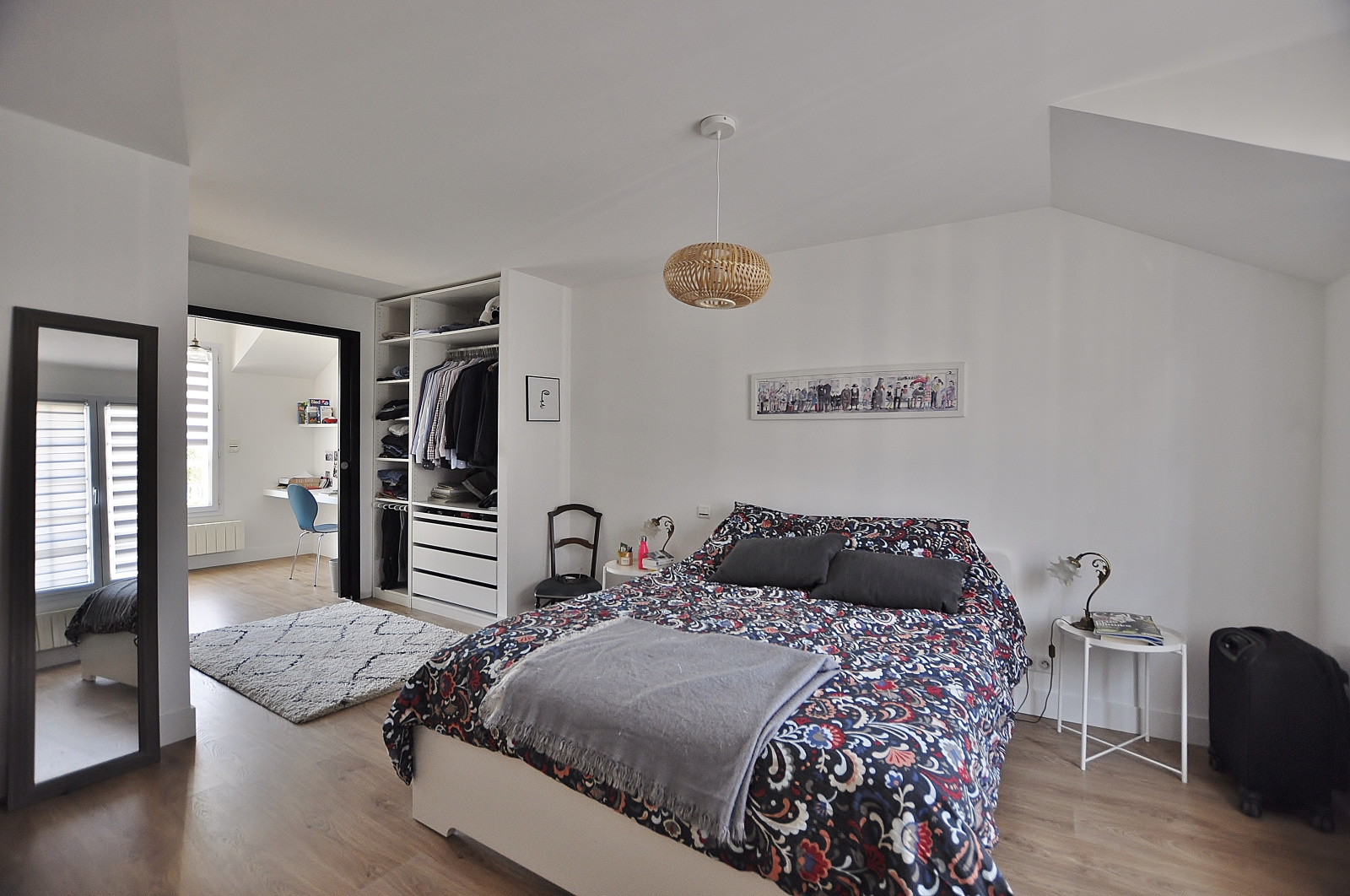 A l'étage, deux chambres avec placard et grande chambre parents avec dressing et espace bureau, salle de bain (douche - baignoire) et wc.