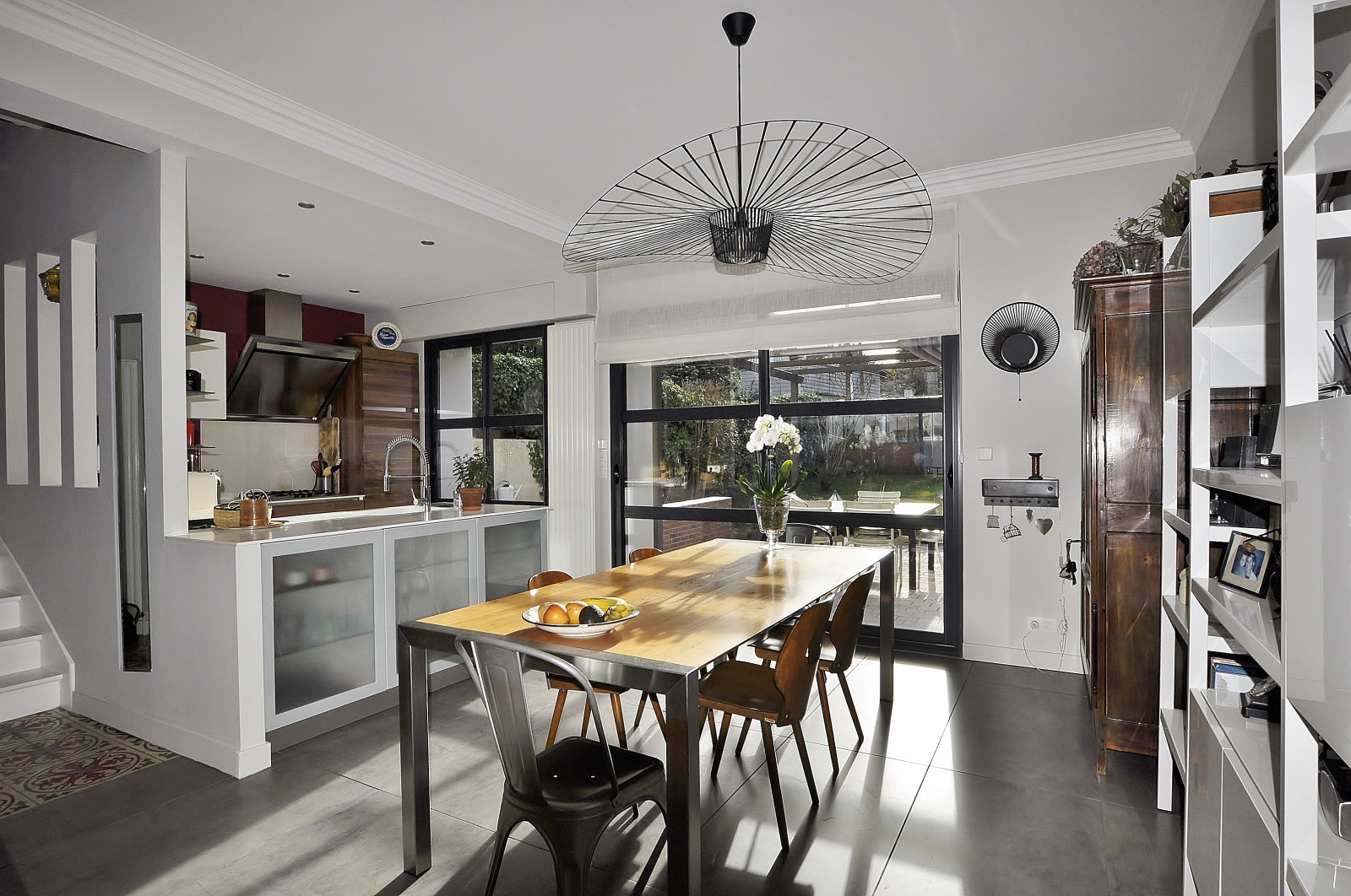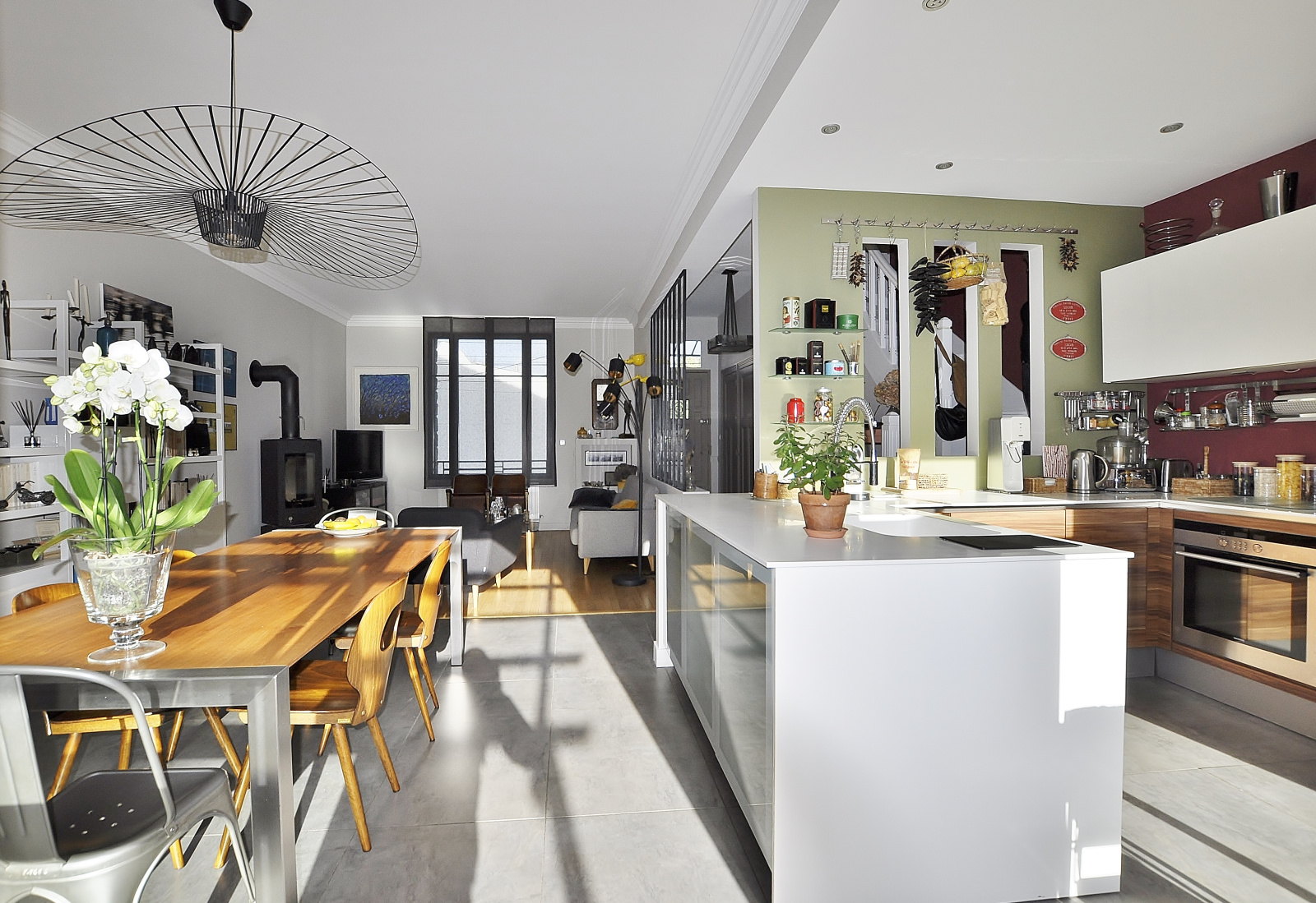 Entrée avec verrière, wc, placard, salon avec poêle à bois, cuisine aménagée et équipée ouverte sur salle à manger donnant sur terrasse et jardin sud/sud-ouest