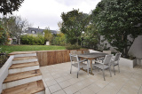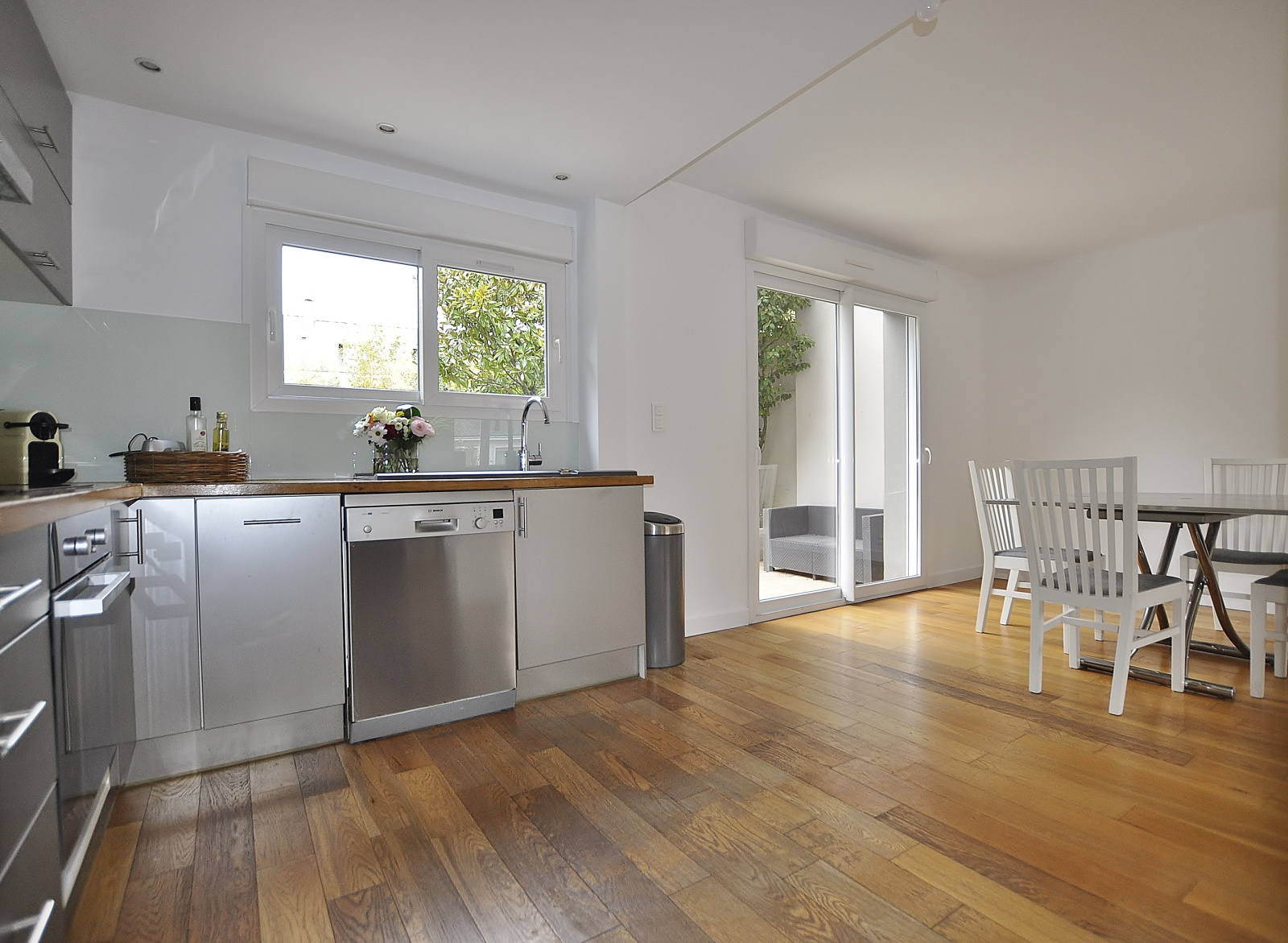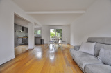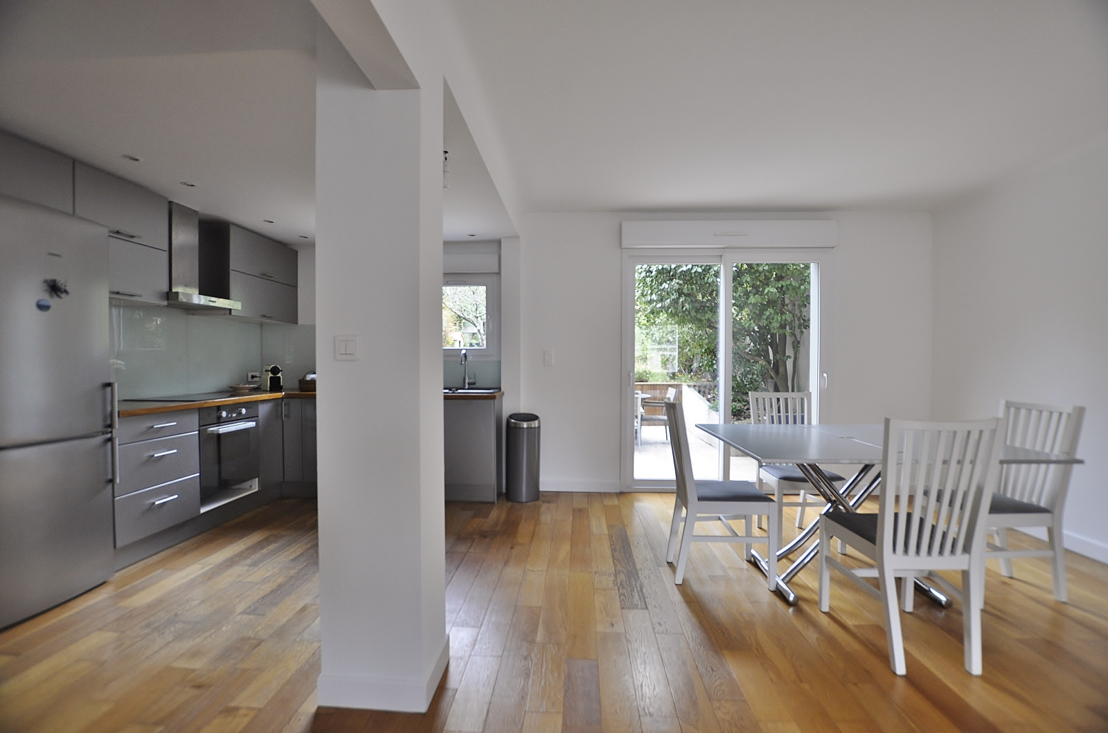 Entrée, salon séjour et cuisine ouverte aménagée et équipée, l'ensemble environ 40 m² sur terrasse et jardin.