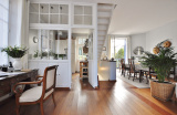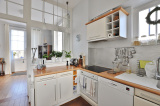 Entrée sur bureau, salon salle à manger (cheminée) traversant sur petite terrasse plein sud, cuisine aménagée et équipée.